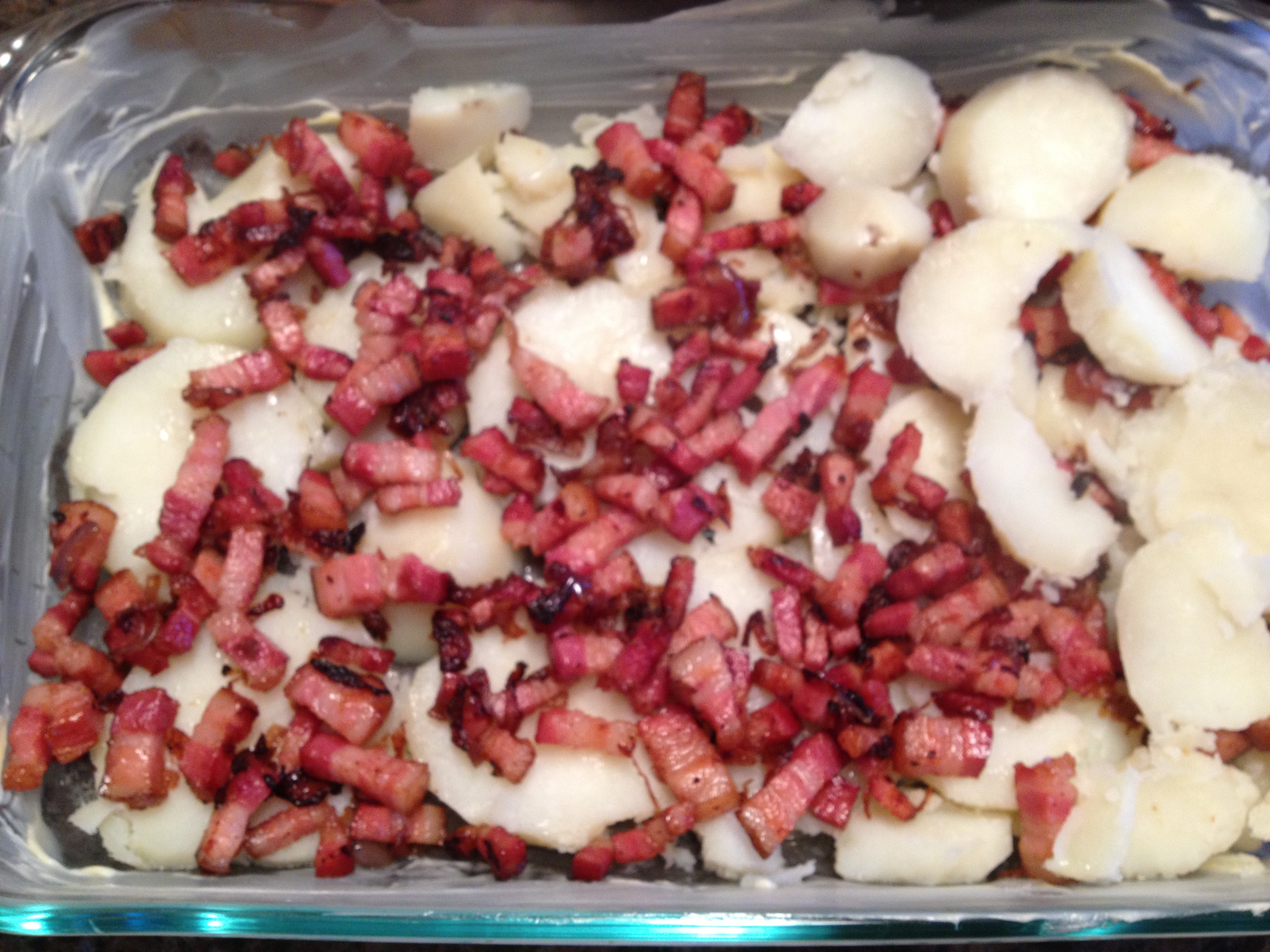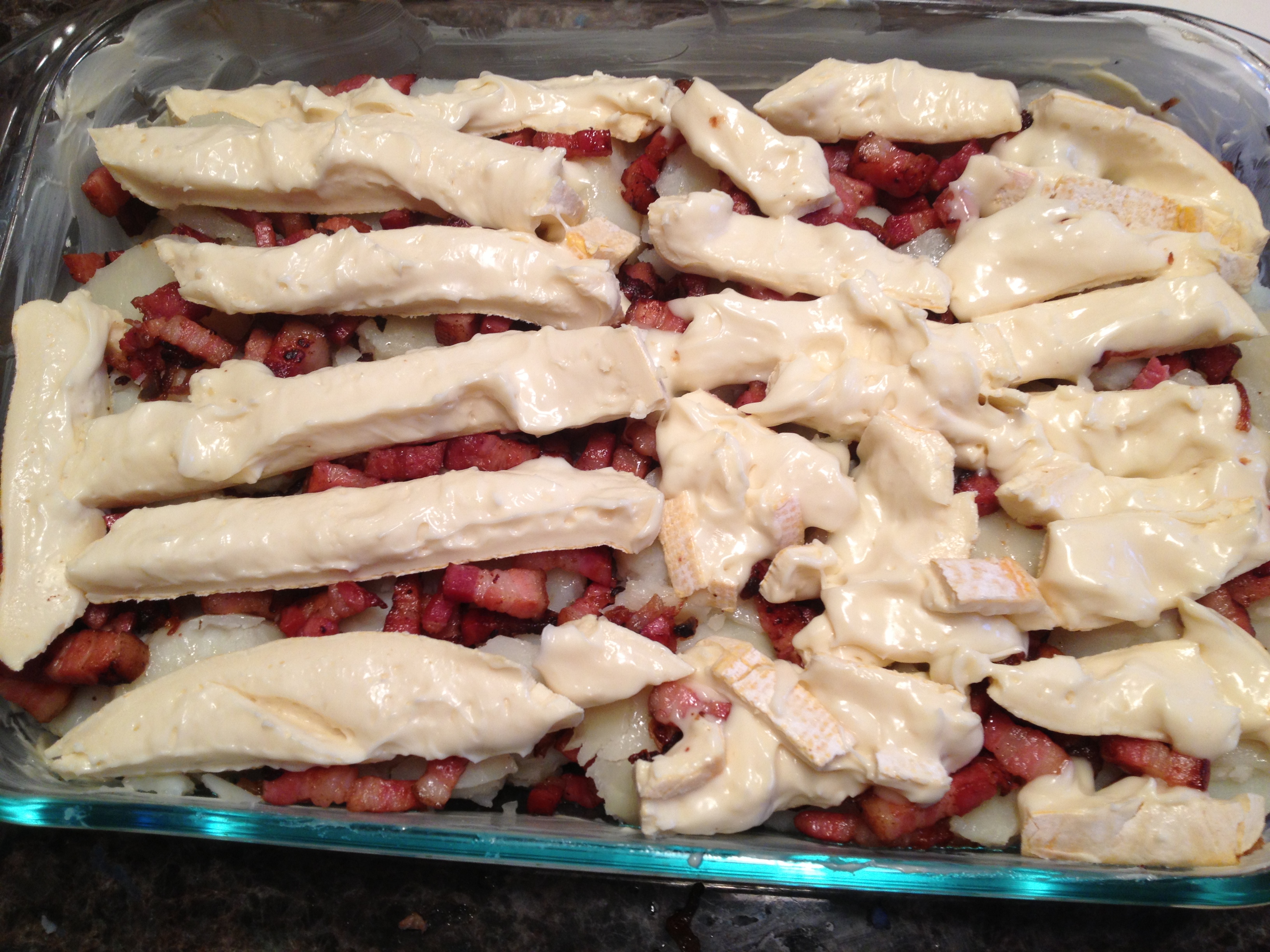 Une couche de patates, une couche de lardons, une couche de patates, une couche de lardons: